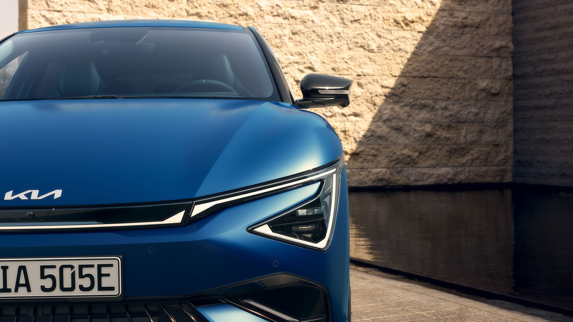 Der EV6 GT beeindruckt mit einer breiten, dynamischen Frontpartie und auffälligen Tagfahrlichtern im Star-Map-Design. Eine LED-Lichtleiste in der Mitte verbindet die Tagfahrlichter visuell miteinander, ergänzt das GT-Design der Front und verleiht dem Erscheinungsbild noch mehr sportlichen Reiz.